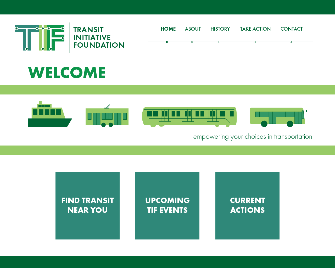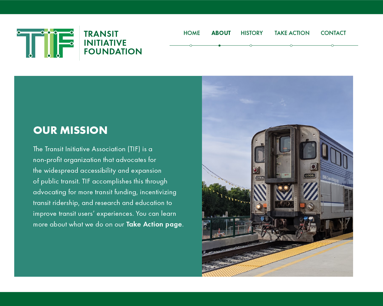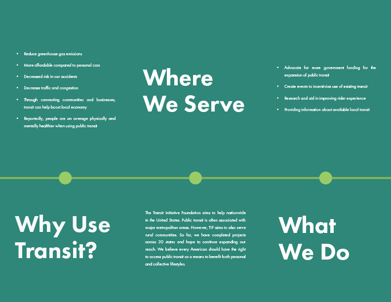 COMPANY DESCRIPTION: "Transit Initiative Foundation - empowering your choices in transportation" | The Transit Initiative Foundation (TIF) is a non-profit organization that advocates for the widespread accessibility and expansion of public transit. TIF accomplishes this through advocating for more transit funding, incentivizing transit ridership, and research and education to improve transit users' experiences.